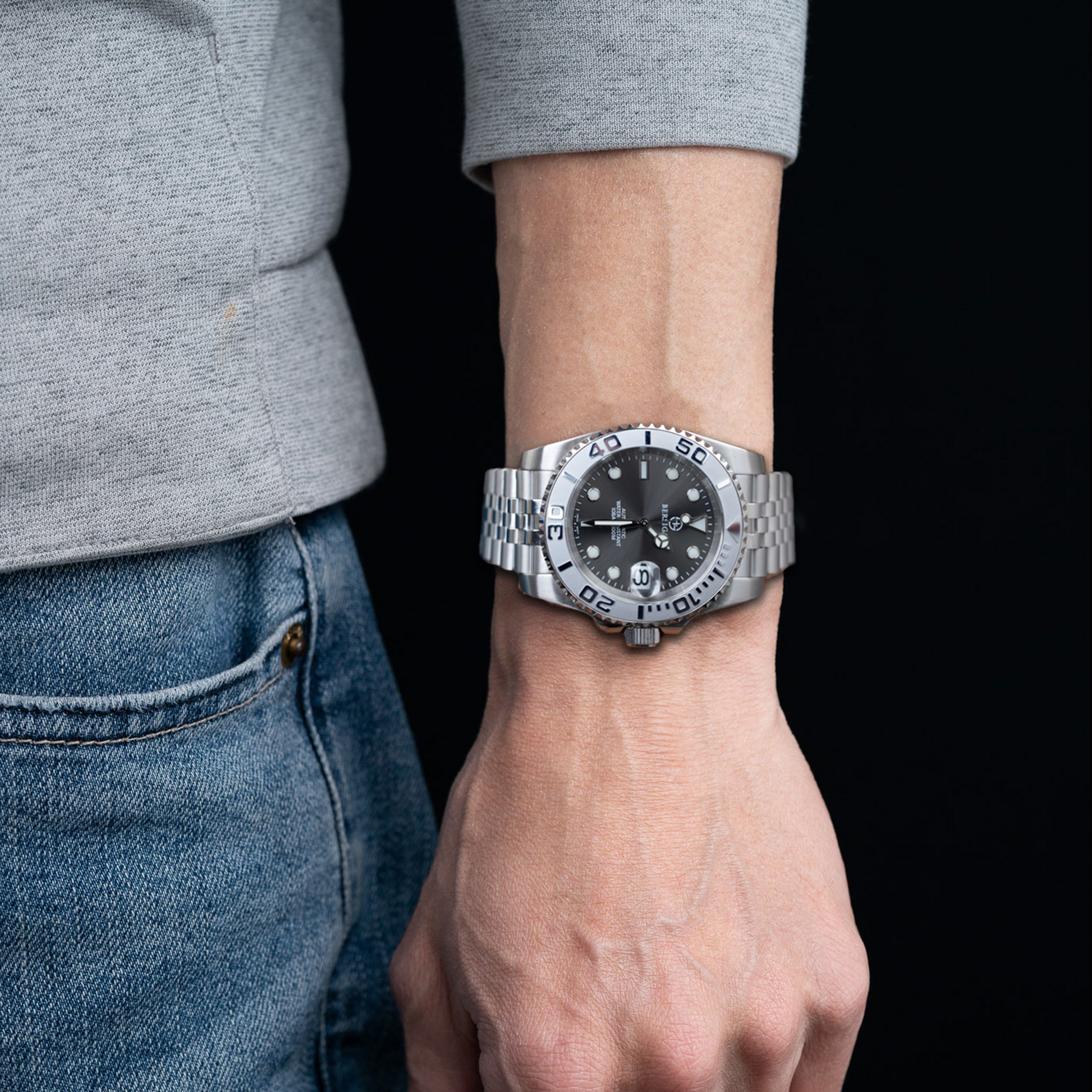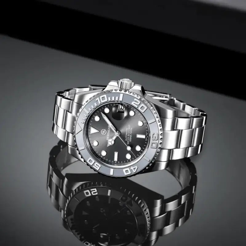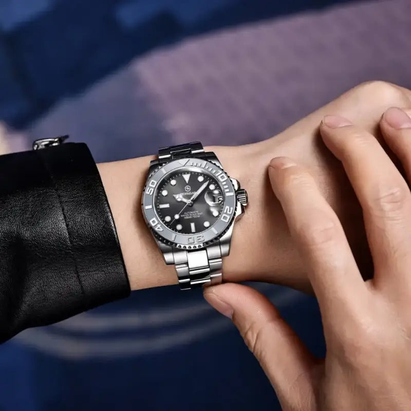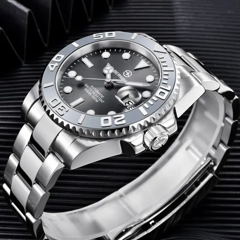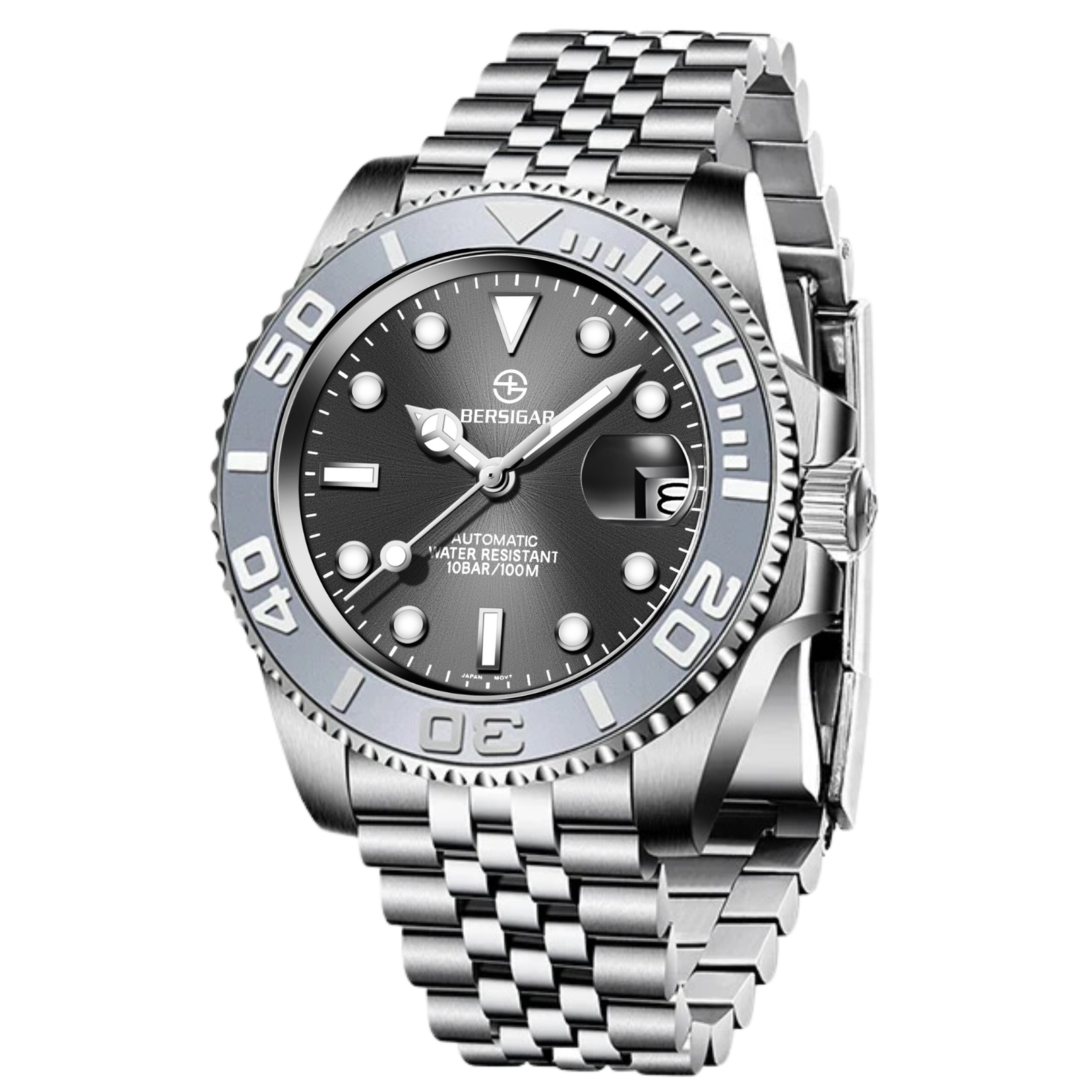 Bersigar luxaura 1651 Premium materials and casual design, Crystal Sapphire Glass dial window, full 316L stainless steel construction with screw-down crown, Ceramic Bezel can be rotated counterclockwise and transparent case back, solid and flexible watchband with classic fold-over clasp.